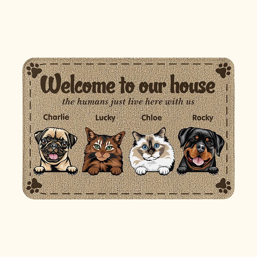 We printed "Welcome To My/Our House The Humans Just Live Here With Us/Me" on the doormat. The fun and witty message adds interest to the doormat and expresses pet owners' love for their furry friends.