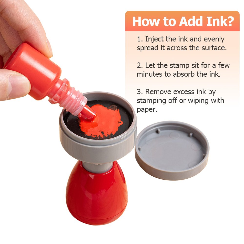 1. Inject the ink and evenly spread it across the surface. 2. Let the stamp sit for a few minutes to absorb the ink. 3. Remove excess ink by stamping off or wiping with paper.