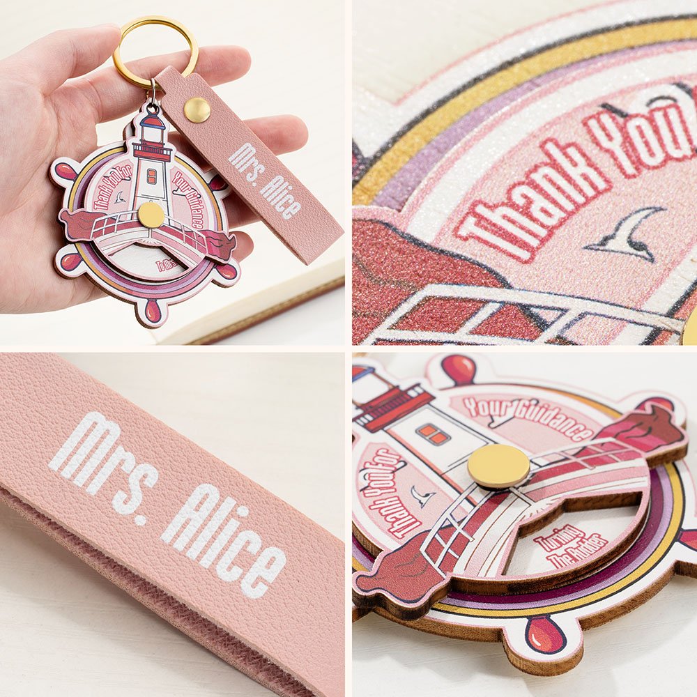 Celebrate the leadership and influence of educators with our lighthouse keychain. This design combines lighthouses, ships, rudders, and rainbows to symbolize guidance and support. You can add your name and your teacher's name, as well as special blessings, to create a unique keepsake highlighting teachers' valuable role in shaping young minds.