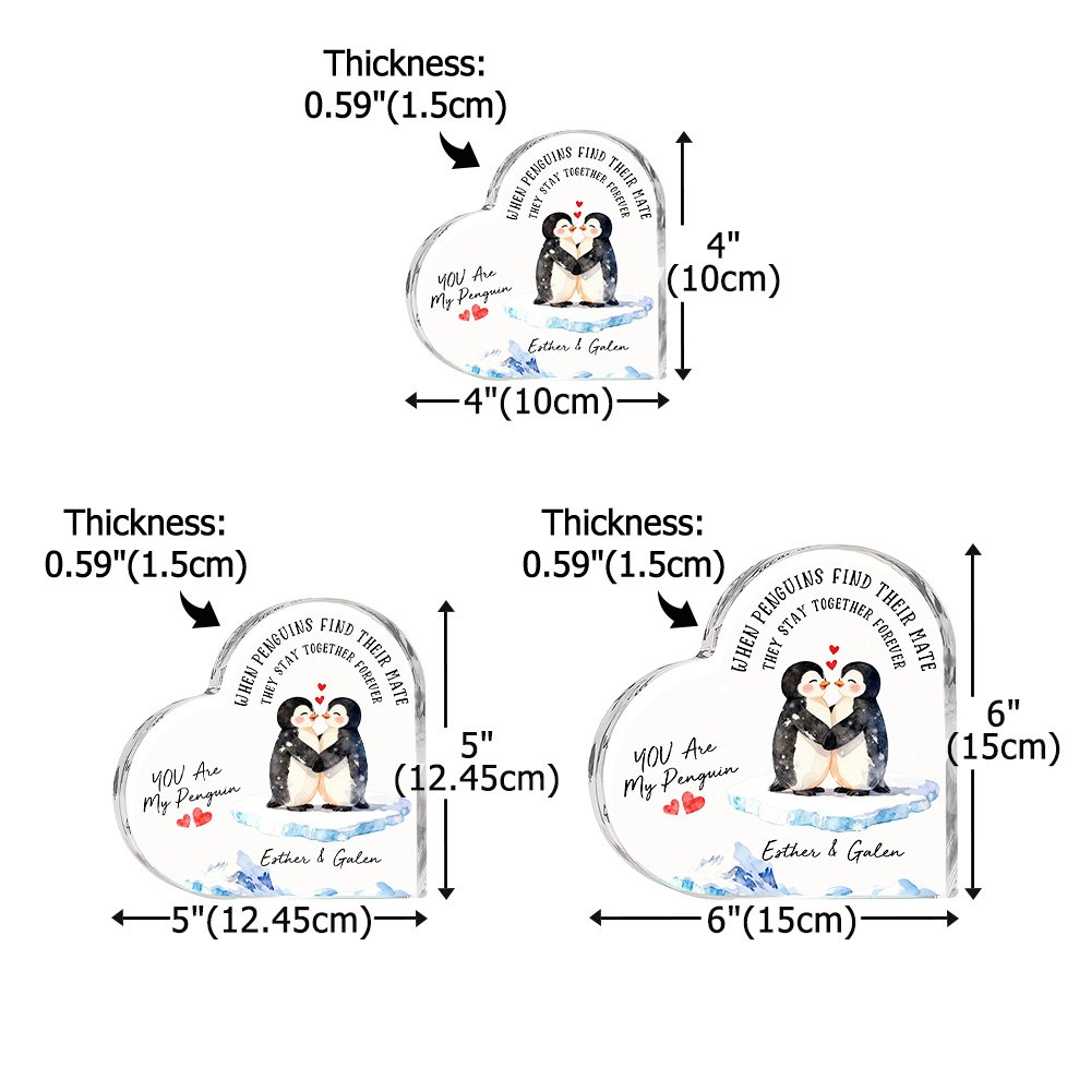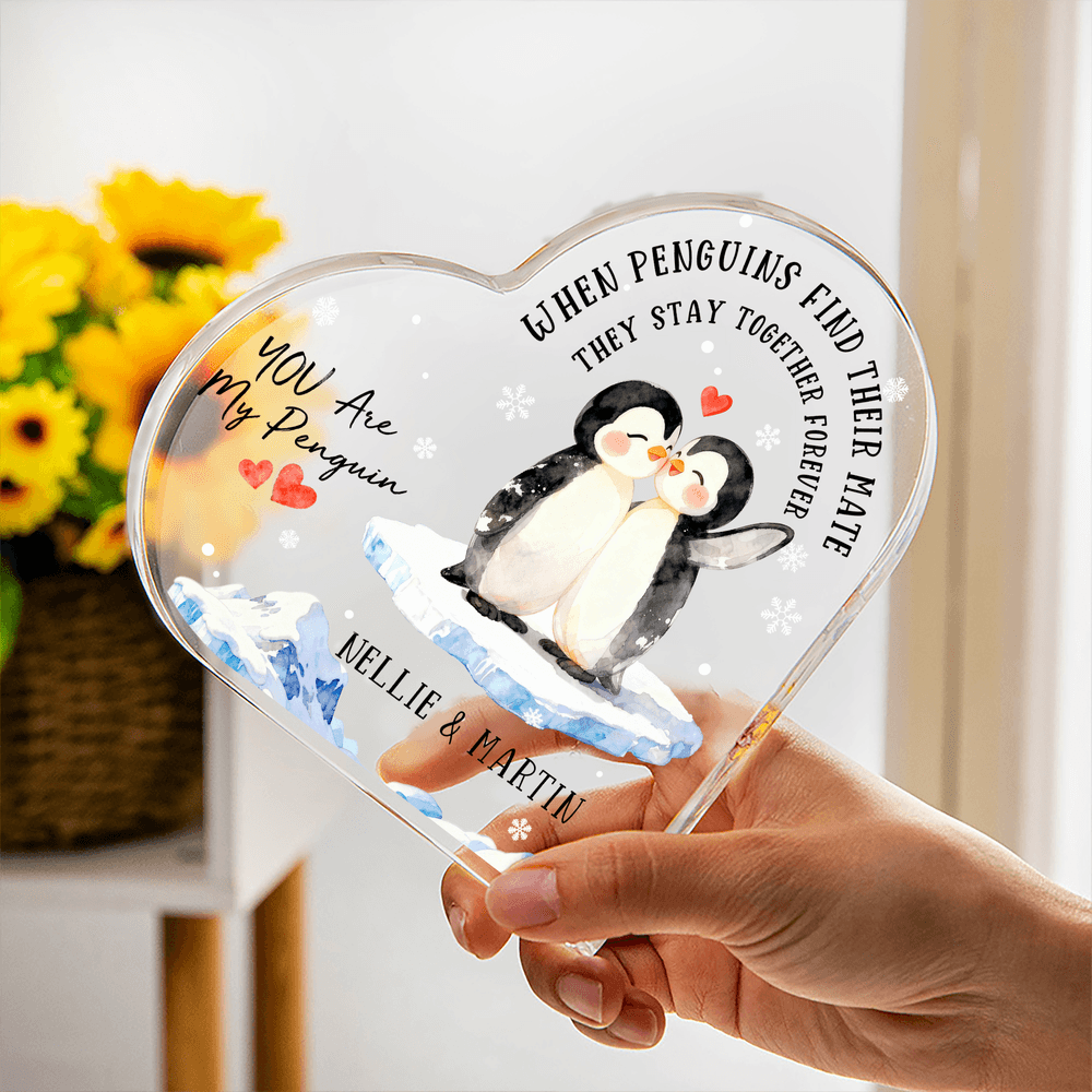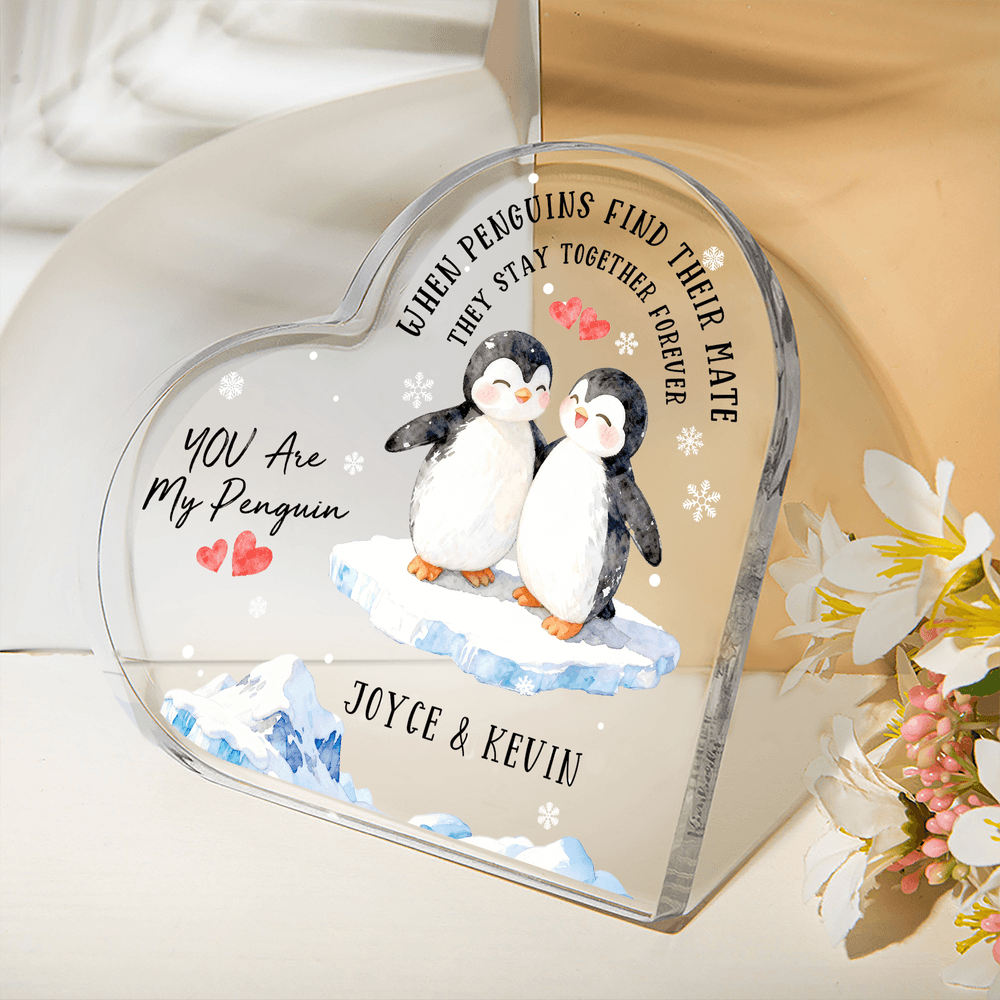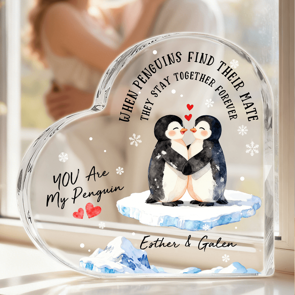 This heart-shaped keepsake draws inspiration from the loyal tale of "penguins mating for life." It features four adorable penguin couple designs, paired with heartwarming messages and the sweet confession "You Are My Penguin." Personalized with both names, it encapsulates a lifelong commitment within a crystal-clear heart, expressing a uniquely personal romance.