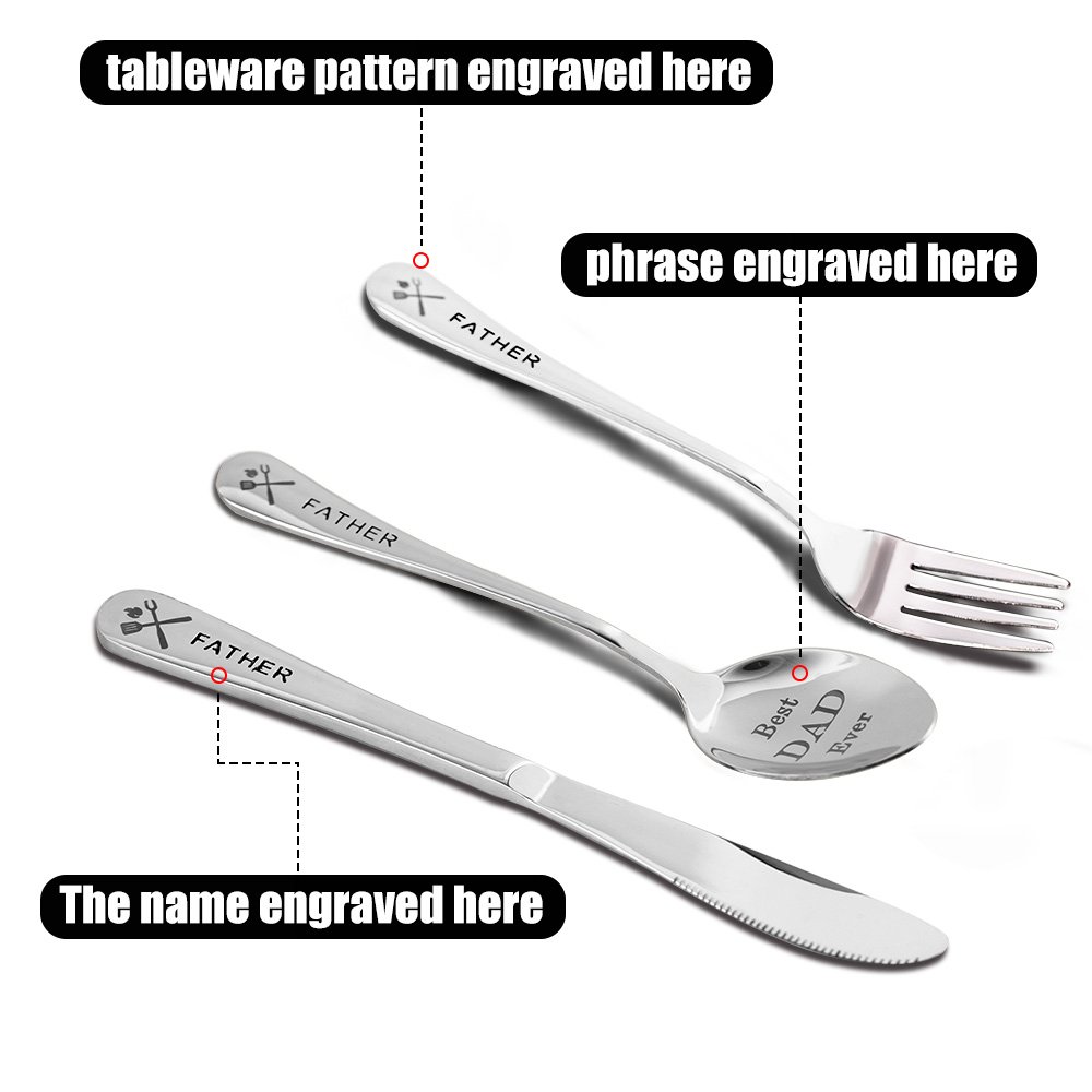 •This silver cutlery composed of a knife, a fork and a spoon. Provides seven patterns to choose from, BBQ, golfing,jeep,kayaking,basketball, football, boxing, games, a wide variety of choices. You can select images according to the father's interest; at the same time, you can engrave your favorite phrases or choose not to engrave any text on the spoon. On the handle of the cutlery, add the name you want to add the uniqueness of the cutlery.